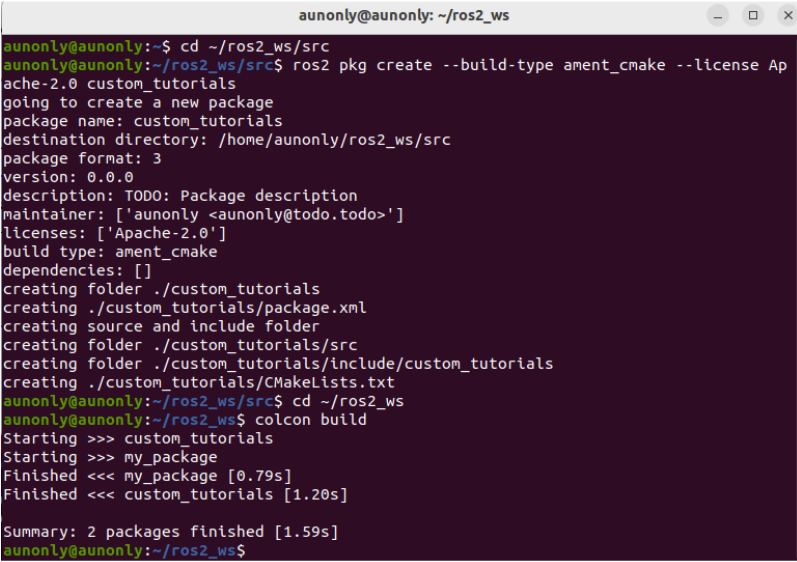 ros2 pkg create --build-type ament_cmake --license Apache-2.0 custom_tutorials