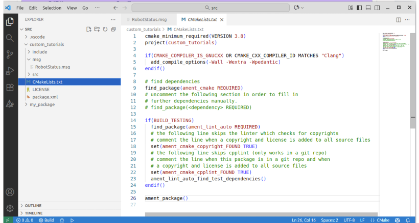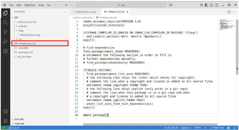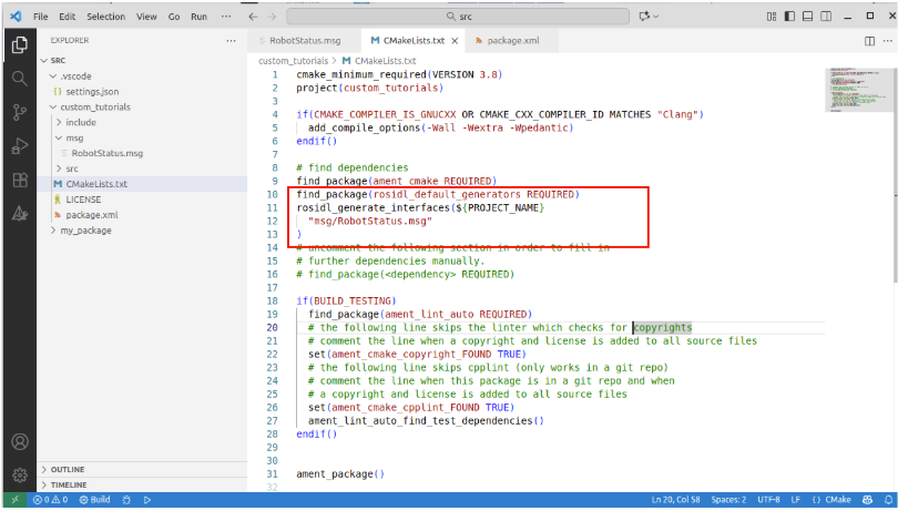 เมื่อสร้างไฟล์ .msg ใหม่ เช่น RobotStatus.msg เราต้องปรับสองไฟล์หลักในแพ็กเกจที่สร้าง message คือ