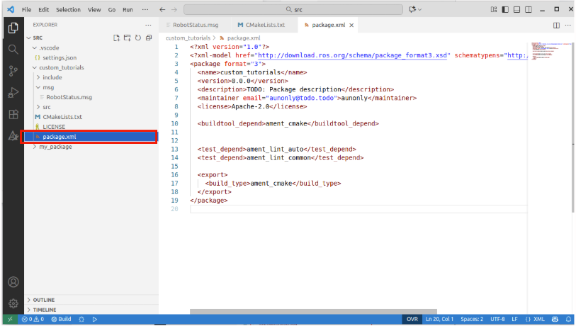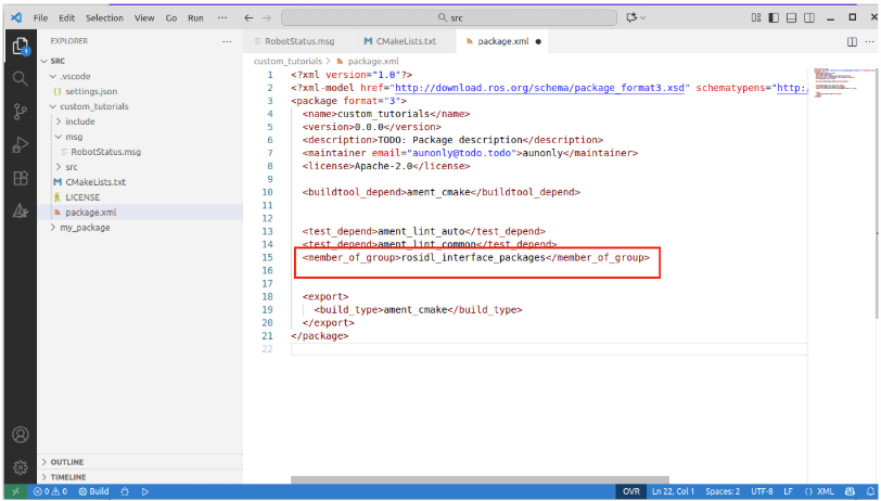 (1) package.xml บอก ROS ว่าแพ็กเกจนี้เป็น “interface package” ที่ต้อง generate message: