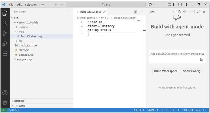 จากนั้นเขียนเนื้อหาในไฟล์ RobotStatus.msg ดังนี้