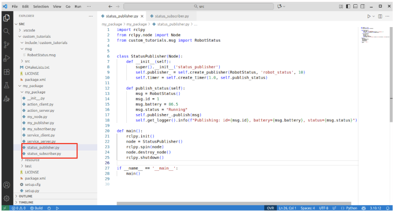 สร้าง โหนด status_publisher.py และ status_subscriber.py ภายใน my_package