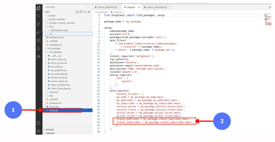 ในหัวข้อนี้เราจะสร้างโหนดตัวอย่างไว้ในแพ็กเกจ my_package (ชนิด ament_python) เพื่อทดสอบการสื่อสารแบบ Publisher/Subscriber โดยจะ อ้างอิงและใช้งานข้อความที่เราสร้างไว้ในแพ็กเกจ custom_tutorials (ชนิด ament_cmake) คือ custom_tutorials/msg/RobotStatus