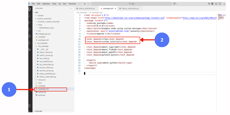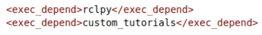 <exec_depend>custom_tutorials</exec_depend> → เพื่อให้ระบบรู้ว่าต้องใช้ message จาก custom_tutorials <exec_depend>rclpy</exec_depend> → เพราะโหนดของเราใช้ ROS 2 Python API (rclpy)