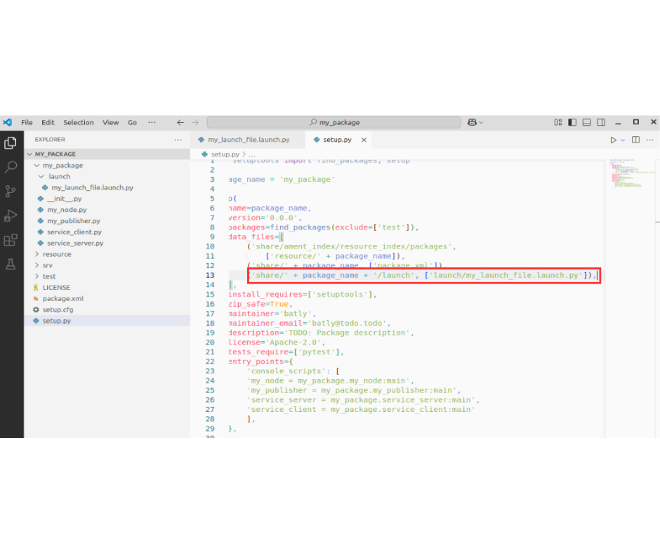 เพิ่ม: ('share/' + package_name + '/launch', ['launch/my_launch_file.launch.py']),