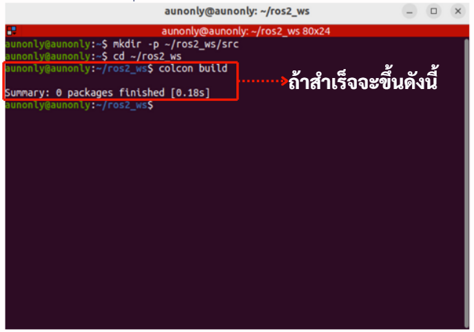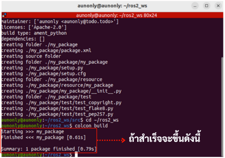 หลังจากสร้างไฟล์ Python เสร็จสิ้นแล้ว ขั้นตอนต่อไปคือ การคอมไพล์ด้วยคำสั่ง colcon build