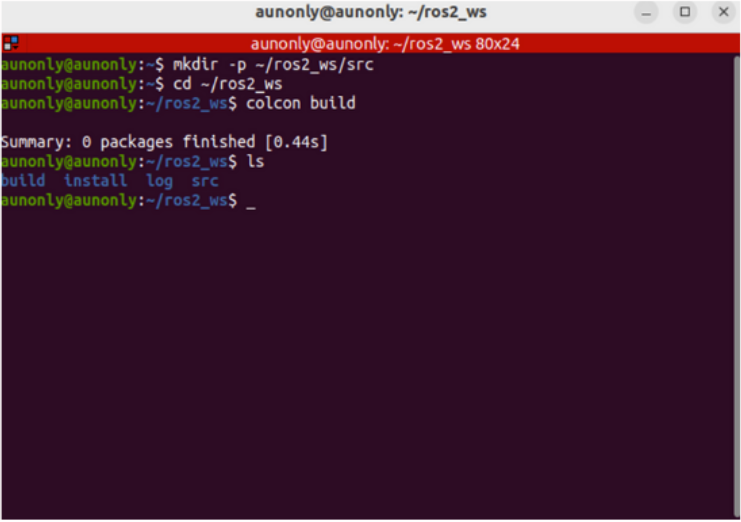 สร้างโฟลเดอร์ Workspace ros2_ws และโฟลเดอร์ src/ สำหรับเก็บแพ็กเกจ |