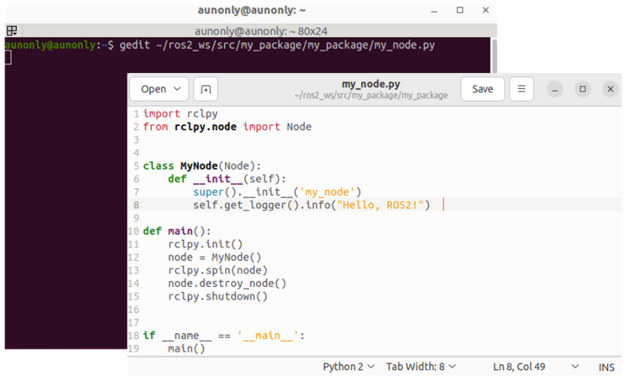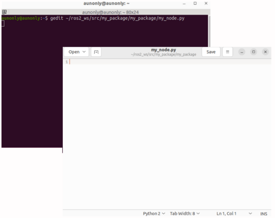 เปิดไฟล์ my_node.py ด้วย gedit เพื่อแก้ไขโค้ด |