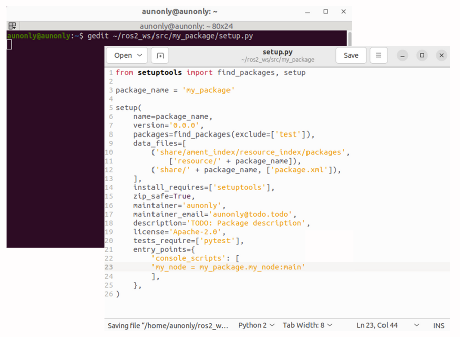 หลังจากที่เราสร้าง Node ใน Python แล้ว จำเป็นต้อง ตั้งค่าไฟล์ setup.py เพื่อให้ ROS 2 สามารถรัน Node ได้อย่างถูกต้อง แก้ไขไฟล์ setup.py ด้วยคำสั่ง: