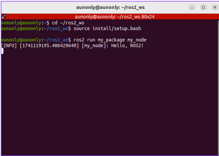 ข้อความ [INFO] ... [my_node]: Hello, ROS 2! แสดงว่าการทำงานของโหนดสำเร็จ และโหนดได้ทำการพิมพ์ข้อความผ่าน get_logger().info("Hello, ROS 2!") สรุปคำสั่งและคำอธิบาย