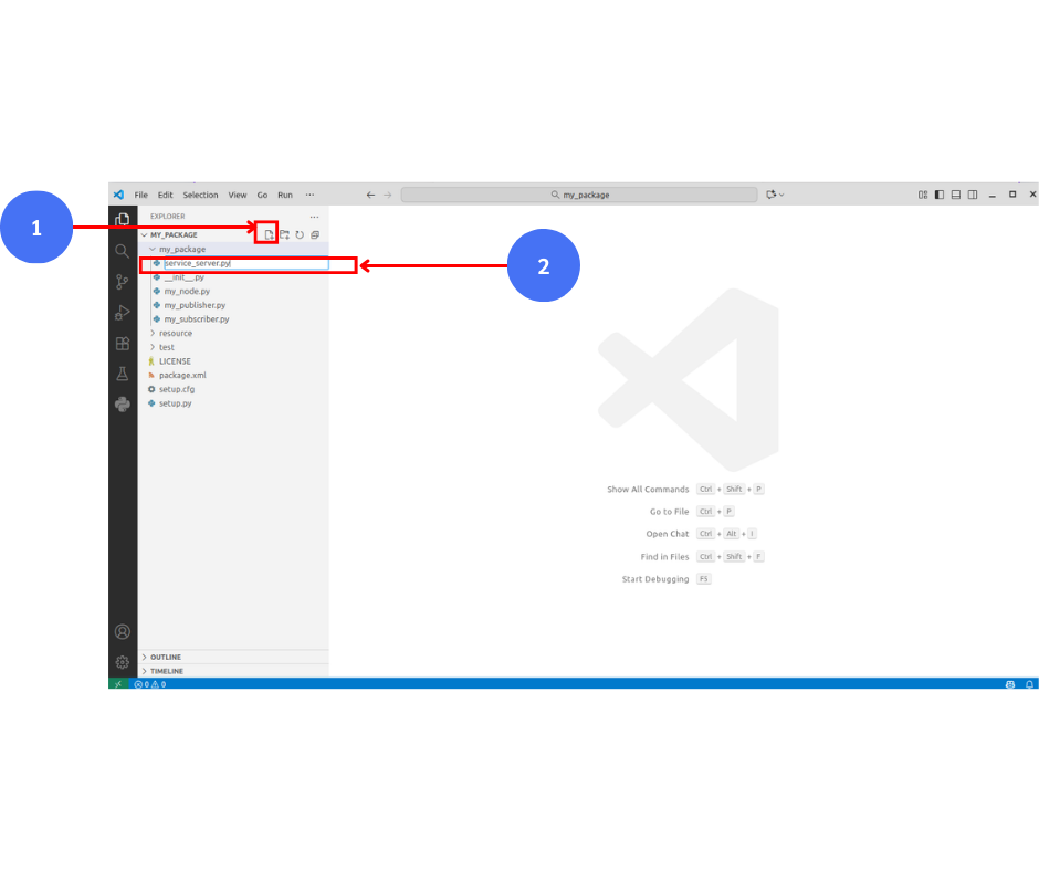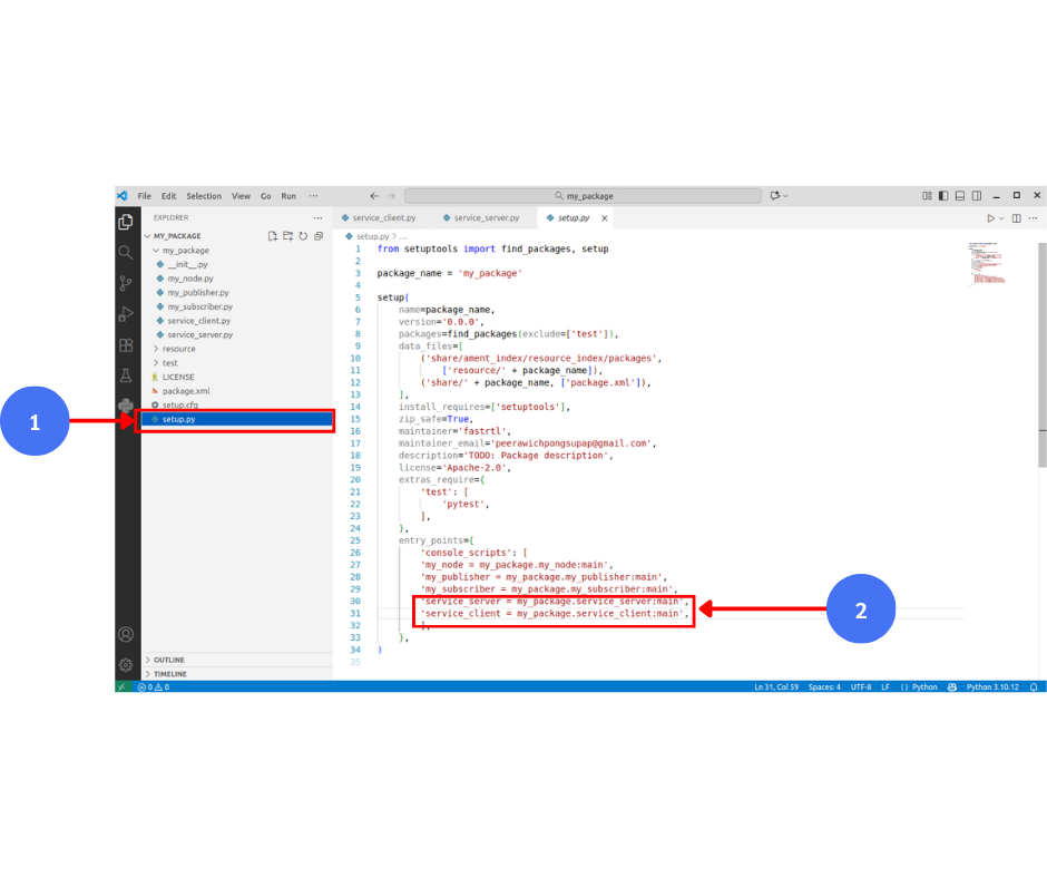 สร้าง Service ใน ROS 2 ที่ให้ Client สามารถส่งตัวเลขสองตัว (a และ b) เพื่อให้ Service Server ทำการ คูณ ตัวเลขทั้งสองแล้วส่งผลลัพธ์กลับไปยัง Client โดยใช้โปรแกรมที่เขียนด้วยภาษา Python ดังนี้
